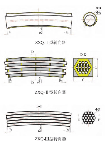 ZXQ-Ⅲ型轉(zhuǎn)向器為鋼管組焊式分絲管轉(zhuǎn)向器,由多根小鋼管組焊而成,鋼絞線各自平行獨(dú)立穿過各小鋼管,使鋼絞線受力均勻,可以單根換索。其截面比ZXQ-Ⅱ型轉(zhuǎn)向器小,能適用于結(jié)構(gòu)緊湊的場(chǎng)合中。